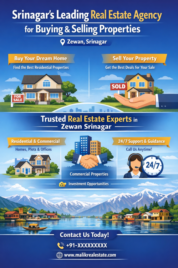 If you are looking for real estate agency for buying & selling properties in Zewan Srinagar, Malik Real Estate is your trusted partner. We provide professional guidance for residential, commercial, and investment properties across Srinagar (191101). Our experienced team ensures smooth and transparent property transactions.Srinagar’s Leading Buying & Selling Properties.